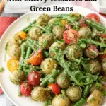 This Arugula Pesto Potato Salad combines tender baby potatoes and crisp haricots verts with a vibrant, homemade arugula walnut pesto. The fresh, peppery flavor of arugula pesto made with walnuts, parmesan, garlic, and olive oil perfectly dresses the colorful heirloom cherry tomatoes and green beans. Ready in just 20 minutes, this salad is a refreshing, flavorful side dish ideal for spring and summer gatherings.