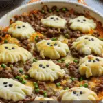 This Spooky Shepherd’s Pie is a festive Halloween twist on the classic comfort food. It features layers of seasoned pork, sautéed mushrooms and onions, mixed vegetables, and a rich gravy, all topped with adorable mashed potato ghosts made with green pea eyes. It’s perfect for a fun and hearty fall dinner!