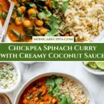 A flavorful and easy-to-make Chickpea Spinach Curry enriched with coconut milk and warm Indian spices. This quick 25-minute dish combines tender chickpeas, fresh spinach, and a creamy tomato-based sauce, perfect for a wholesome vegan meal served with naan or rice.