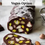 Easy Egg-free Chocolate Salami, also known as Greek Kormos or Mosaiko, is a no-bake dessert featuring rich dark chocolate, crunchy cookies, and walnuts, shaped into a log and coated with powdered sugar. This classic Greek treat is simple to prepare, with a vegan option using plant-based butter and cookies. It requires no oven baking and is firmed up in the freezer, making it a perfect decadent yet easy dessert.