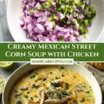 This Mexican Street Corn Soup is a warm, comforting dish inspired by the bold, zesty flavors of traditional Mexican elote. It combines fire-roasted corn, tender shredded chicken, and a creamy, tangy broth enriched with sour cream, cheese, and fresh lime, creating a delightful bowl that tastes just like your favorite street food in soup form.
