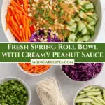 A vibrant and fresh Spring Roll Bowl with Peanut Sauce that combines thin rice noodles, crunchy vegetables, and a creamy, tangy peanut dressing. This quick and easy meal is perfect for a light lunch or dinner, offering the flavors of a traditional spring roll in a convenient bowl format.