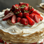 Strawberry Nutella Crepe Cake is a showstopping dessert made with layers of delicate homemade crepes, rich Nutella, fluffy whipped cream, and fresh strawberries. It’s the perfect combination of light and decadent, ideal for celebrations or brunch.