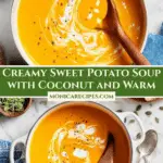 A comforting and creamy Sweet Potato Soup featuring tender sweet potatoes, fragrant spices, and a creamy coconut milk base, garnished with pepitas and fresh cilantro, perfect for a cozy meal.